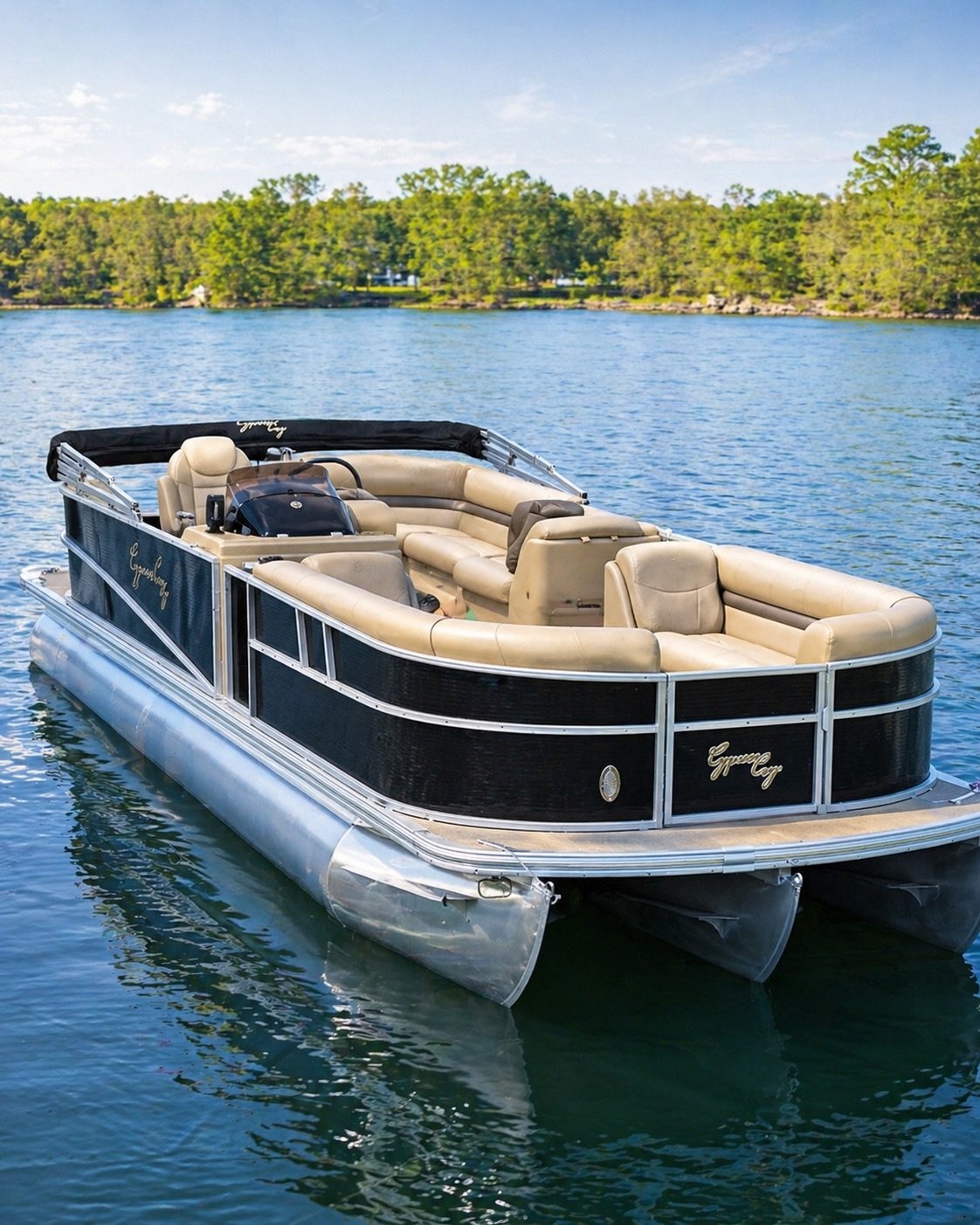 The Cypress Cay pontoon is also a premium Lake Lanier rental pontoon with a 200+ HP Mercury engine, comfortable seating, a bimini top for shade, and a full-day lake layout.