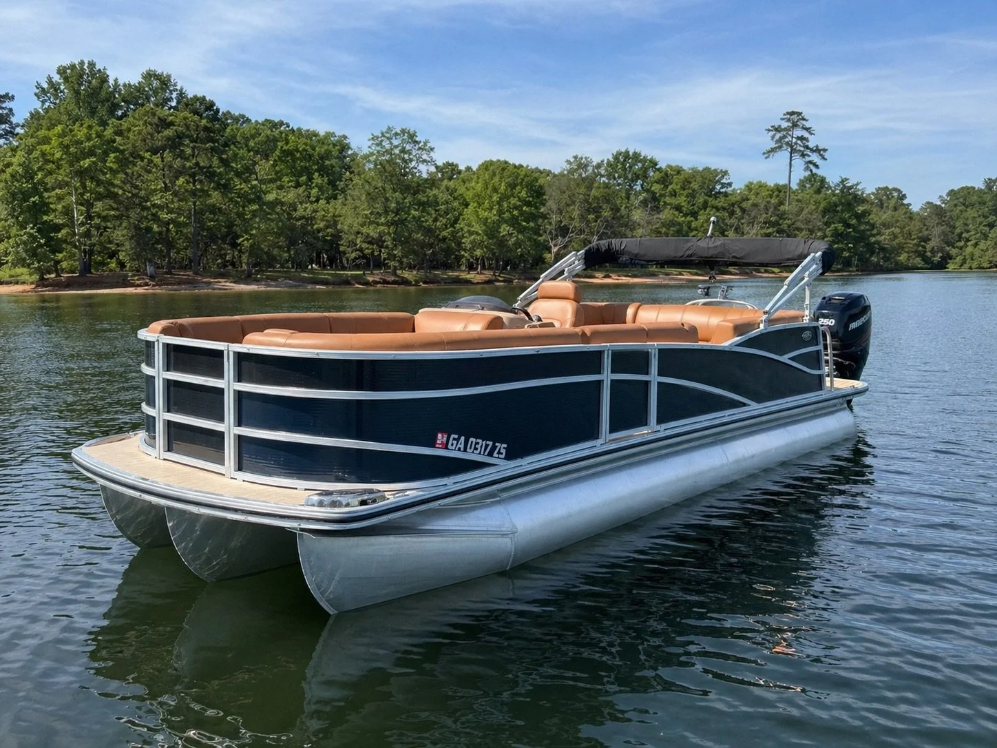 The Harris pontoon is a premium Lake Lanier rental pontoon with a 200+ HP Mercury engine, comfortable tan seating, a bimini top for shade, and plenty of room for a full lake day.